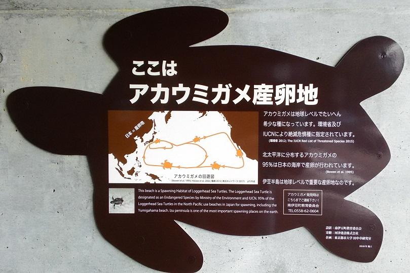 下田や南伊豆の海岸はウミガメの産卵地として知られ、休暇村の前の弓ヶ浜にもこんな看板があります(上の写真も南伊豆で卵が孵化した時のものです)。