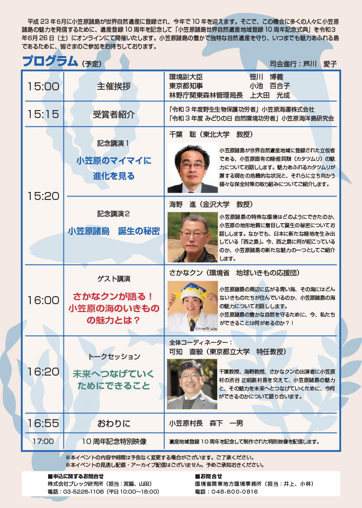 式典では小笠原諸島の自然環境とその魅力をより広く知ってもらうために、小笠原諸島をフィールドにしている研究者の記念講演やメディアでもおなじみのさかなクンのゲスト講演が予定され、貴重な話を聴くことができます。