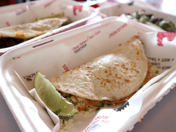 この日は友人とふたりだったので、ケサディアをひとつずつとタコスを半分ずつ食べることにしました。ソースをいろいろ選べるのですが、よくわからなかったので、「おすすめは何?」と聞いて、辛くないソース(緑色)と辛いソース(濃い赤色)をもらいました。ランチでしたが、もちろんマルガリータも注文しました。