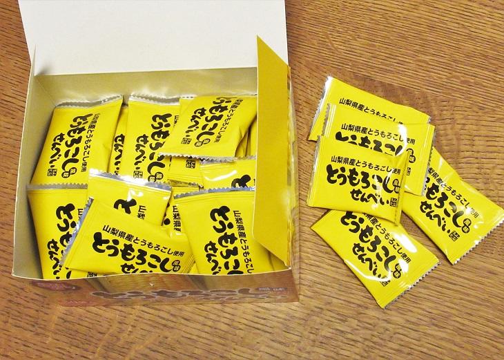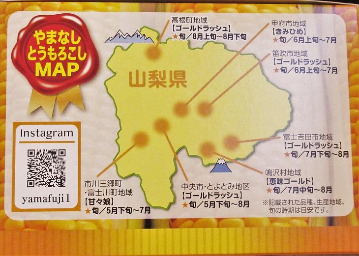 「とうもろこし風味せんべい」の箱には、やまなしとうもろこしマップがありました。