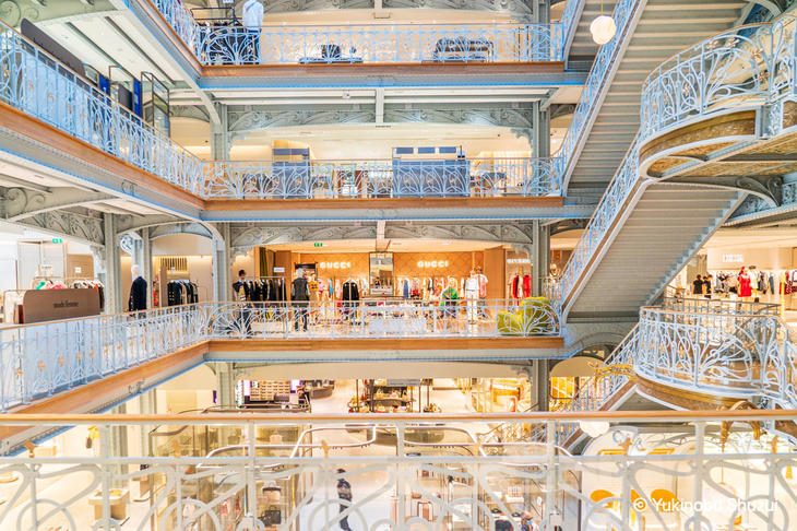 なかでも化粧品売り場はヨーロッパで最も大きな売り場面積を誇ります。北側の地上階は文具やデザイン小物などライフスタイルにフォーカスした売り場で、サマリテーヌのオリジナルグッズも売られています。最上階にはレストラン「Voyage」を配置。館内各所にはカフェなども点在し、ダロワイヨがサマリテーヌで限定展開するパティスリー「L'Eexclusive par Dalloyau」や同サロン・ド・テも入居します。