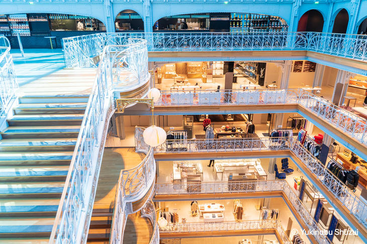 サマリテーヌを構成する建物は大きく3つのデザインに分かれます。まずポン・ヌフ(セーヌ川)に面した南側がホテル「シュヴァル・ブラン」と百貨店の一部売り場が入る建物でアールデコ、真ん中の建物が百貨店が入るアールヌーボー、そして北側のリヴォリ通り沿いは百貨店とオフィスが入る棟で、ここは日本のSANAAによる設計です。