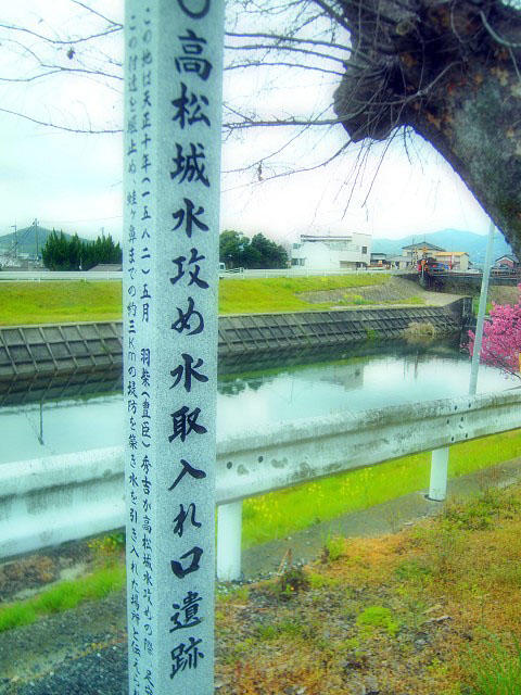 看板が光っていて見えにくいのですが、堤防の高さは高松城の天守閣の屋根とほぼ同じくらいです。いまのような測量機器がなかった時代に、近づくこともできない敵城の屋根の高をどうやって知ったのでしょうかね。