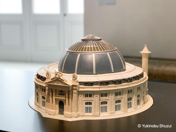 円筒のコンクリート構造の外側には、旧穀物取引所時代からの部屋が、建物の外側に沿って並んでいます。地上階は展示スペースとショップなど、1階と2階が展示スペース、3階にはミシェル&セバスチャン・ブラス親子によるレストラン「Halle aux Grains」が入ります。