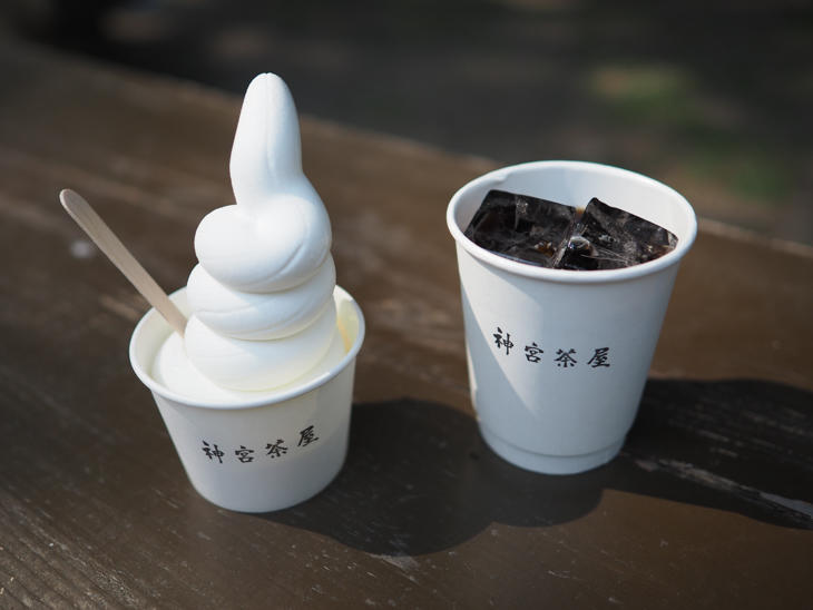 「神宮茶屋」の外にはベンチとテーブルがあり、こちらでそよ風と木漏れ日を楽しみながらおいしいソフトクリームやスイーツを堪能。