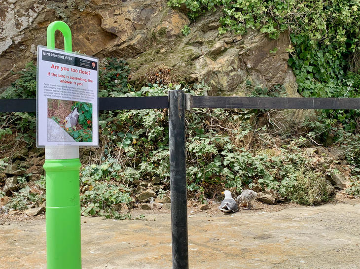 今の時期は、なんといってもカモメの赤ちゃんがいっぱいいます。このように、道端で巣を作り、子育て中のカモメのためにロープを張って注意を促しています。親鳥の鳴き方より高音でピューピューと鳴く声が可愛くてたまりません。