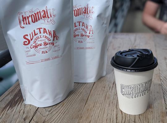 Chromatic Coffeeでは焙煎豆のほかにコーヒー果を生かしたお茶も販売しています。ハイビスカスに似たフルーティーそうなお茶がセールになっていたので、ひとつ買ってみました。このコーヒー果は品揃えが変わるらしく、いまは別のお茶が店頭や通販で買えるようになっています。
