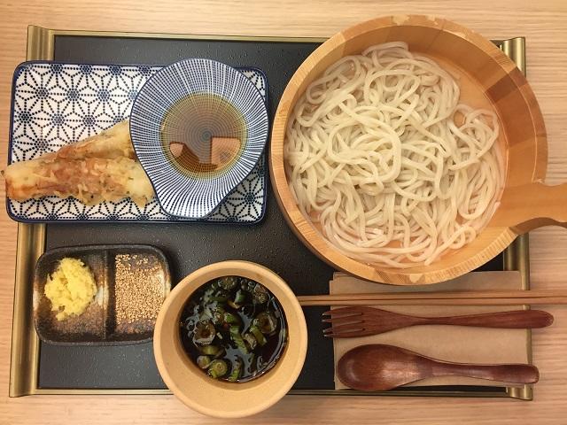 私は釜揚げうどんに、ちくわの天婦羅を追加してみましたよー。シコシコ歯ごたえのうどんも、つゆもおいしくて……懐かしい日本の味に満足・満足。