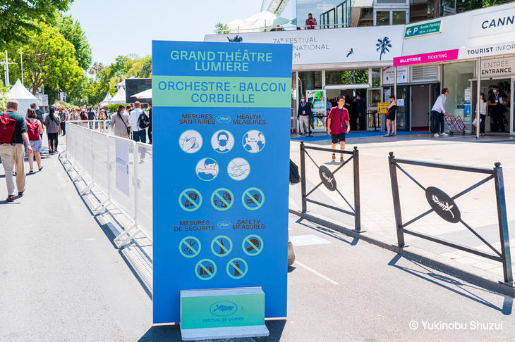 渡航制限がある国が多いため、海外(特にEU域外)からフランスを訪れづらくなっています。そのため、会場内にいる映画関係者や記者などの数も例年より少ないです(毎年カンヌ国際映画祭は、一部を除いて一般には開放されておらず、関係者向けのイベントとして行われています)。また、出品作に出ている役者さんで、「本当は来たかったけど来仏を見送った」という話もちらほら耳にしたり、ニュースで聞きます。