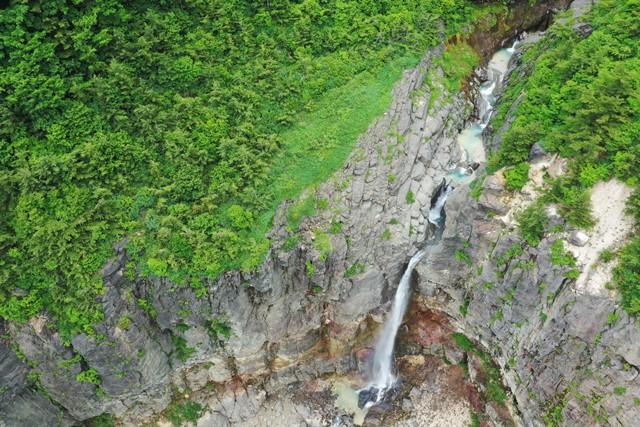 安達太良山の沼ノ平から続く硫黄川の流れと白糸の滝