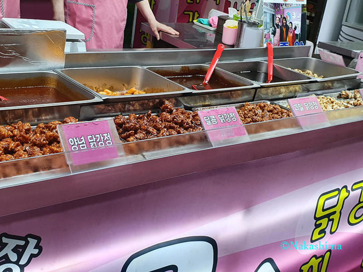 6種類のタッカンジョン(骨なしチキン)があり、小さなカップの量で3000ウォンから食べられるので、いろんな味が少しずつ楽しめそうです。
