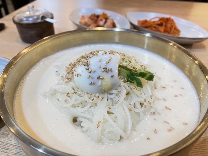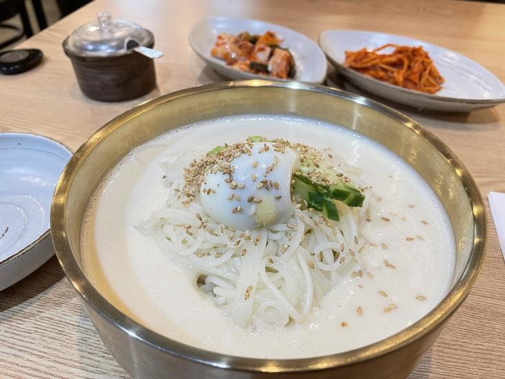 コングクスとはハングルだと「콩국수」、 直訳すると「豆麺」、辞書によると「豆乳素麺」で、豆のスープに素麺が入ったシンプルな麺料理です。