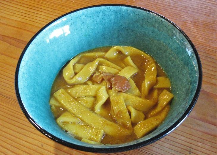 次は、カレーうどん、いってみましょう。鶏肉、油揚げ、玉葱入りです。