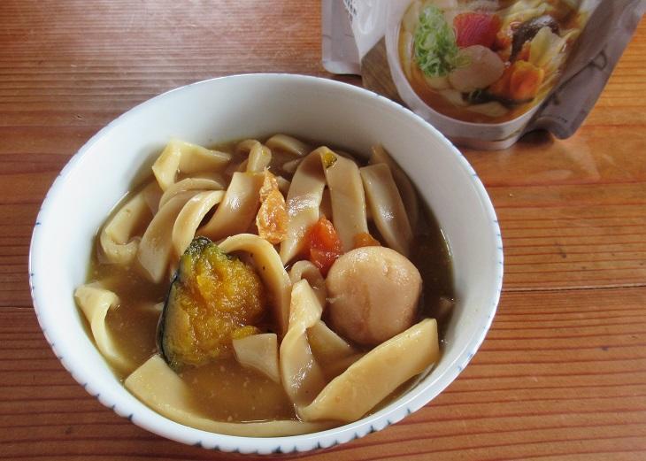ほんと! 麺がもっちもち。野菜と出汁の甘味が効いた優しい味噌味です。南瓜はやわらかく、里芋はしっかりめ。ごろごろと具が入っているのがうれしいですね。非常時にほうとうが食べられると、ホッとするでしょうね。