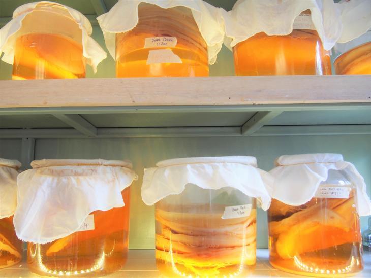 コンブチャはオリジナルのお茶にスコビー菌と砂糖をいれ発酵させて作ります。2階の棚には自家製のコンブチャの瓶ががずらり。コロナ前はコンブチャ作りのワークショップも開催されていたそうです。