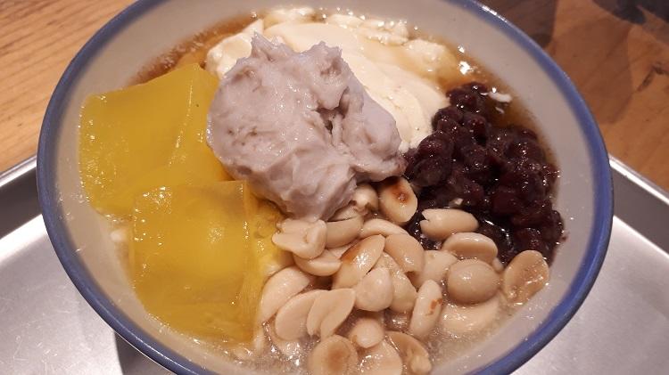 こちらは、南所豆花。トッピングを4種類選ぶことができます。紅豆=小豆、花生=ピーナッツ、台湾伝統粉粿 (フンクエ)、芋頭=タロイモのペーストを選びました。粉粿とはサツマイモのデンプンで作られたわらび餅のようなゼリーで、山梔子=クチナシの果実を加えると黄色くなります。お正月の栗きんとんを作るとき、色をきれいに出すために使うやつですね。黒糖シロップをかけていただきます。