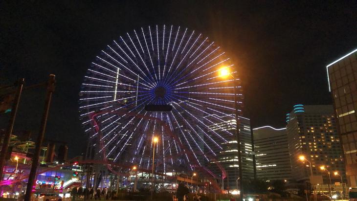 向こうにはライトアップした大桟橋やマリンタワーも見えます。