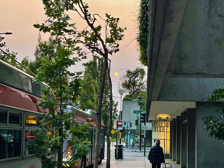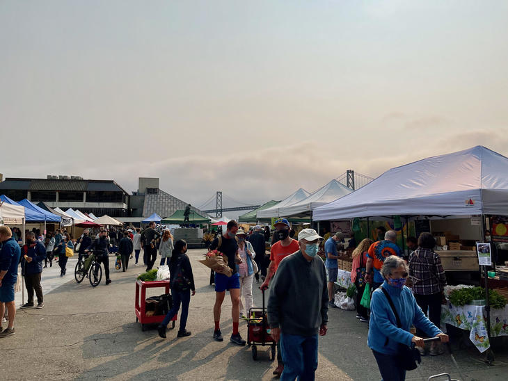ただ今週は、かなりのお客さんがマスク着用していていました。その原因のひとつが、森林火災。サンフランシスコから車で4~5時間、州都サクラメントからは、260km北東で先月14日夜中に発生した"ディキシーファイア(Dixie Fire)"の煙が、内陸からの乾いた風にのり、土曜早朝サンフランシスコに到達したのです。空気の汚れを心配してマスクを着用しています。