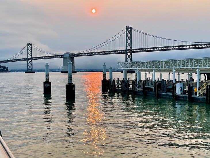 イーストベイ・オークランド港上空に登る朝日は、まるで夕陽。