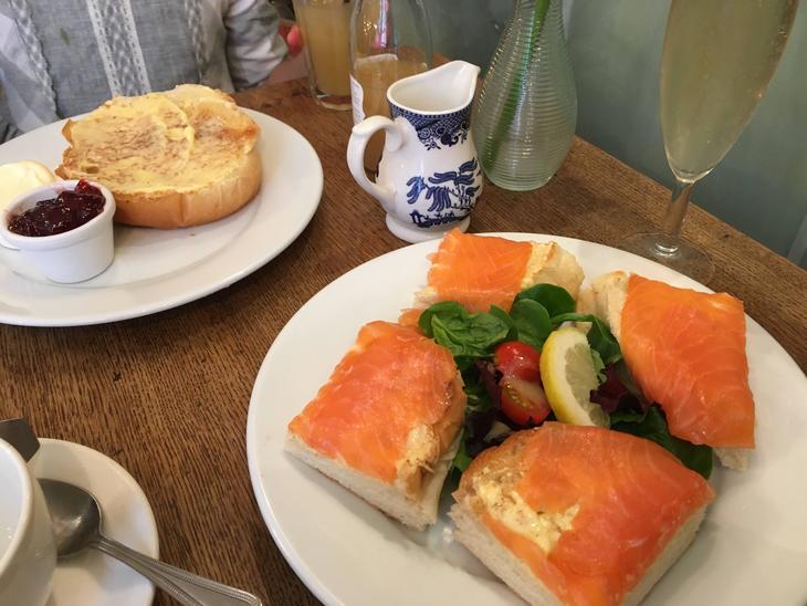 期待を胸に、甘いものと甘くない食事タイプの両方がつくハイ・ティー(£13.48)をシャンパン(£7.48)つきで頼みました。出てきたのはスモーク・サーモンと、通常はスコーンにつけるクロテッド・クリームといちごジャムのバンズ。