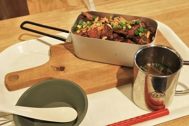 メスティンの器を特徴とするステーキ丼で、マグカップには「923・SA」の文字も♪