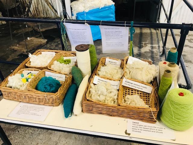 英語とウェールズ語表記の案内には、原毛 → カーディング(毛をすいて、繊維の方向をそろえる)→ 撚り糸 → スピニング(2本以上の糸を合わせる)→ 洗浄 → 染色 → ウィービング(織り)の順で加工工程が説明されていました。
