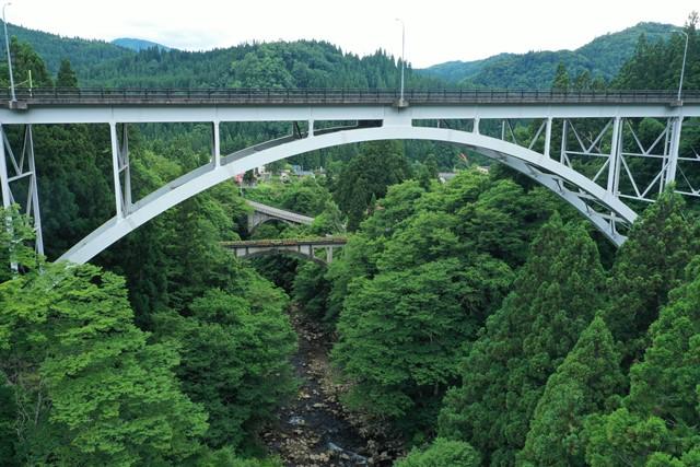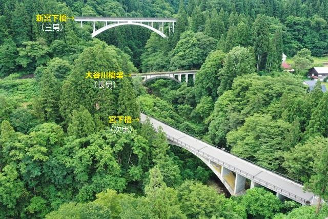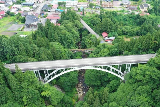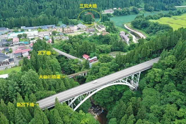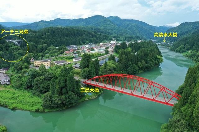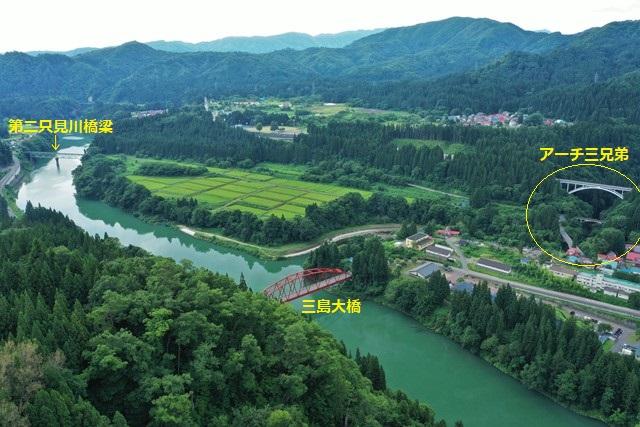 三島大橋付近を中心に第二只見川橋梁とアーチ三兄弟を俯瞰しました。
