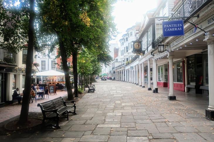 パンタイルとは瓦のことで、当時は瓦が敷き詰められていた遊歩道が名前の由来です。現在ではコンクリート石にとって替わられていますが、商店街を支える柱が当時の栄華を思い起こす特徴ある建築物だったりと、タンブリッジ・ウェルズ公式観光サイトも「有名チェーン店で埋まるショッピング・モールじゃないのよ!」と声高々に主張するほど趣のある通りです。