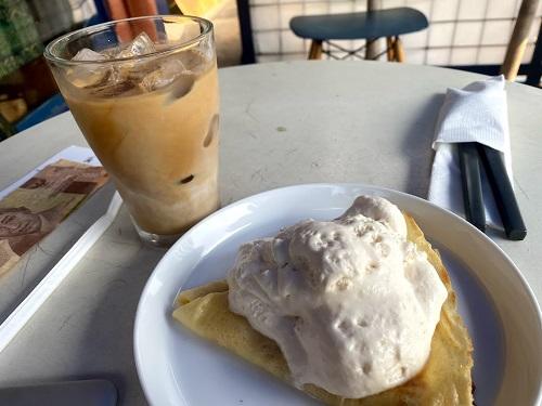 テラス席ならOKといわれたので、クレープ&バニラアイス+アイスラテ。