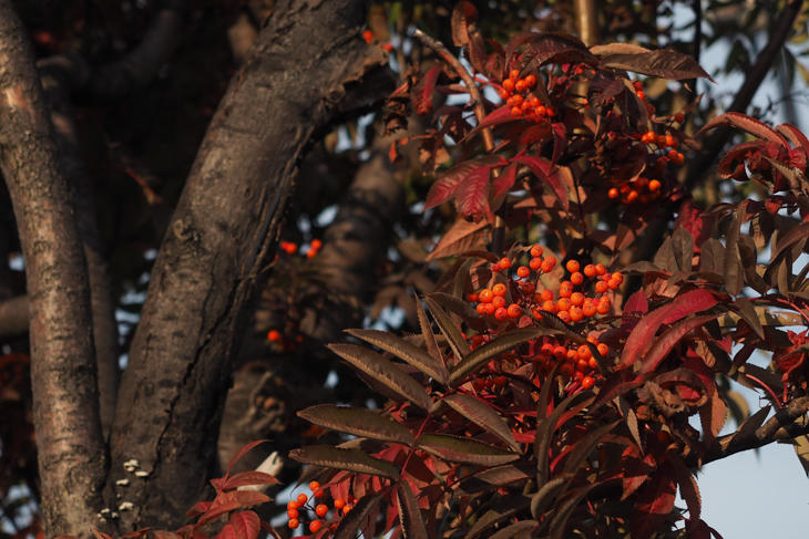 夕日に照らされたこの時期のナナカマドは、燃えるような赤い姿になります。