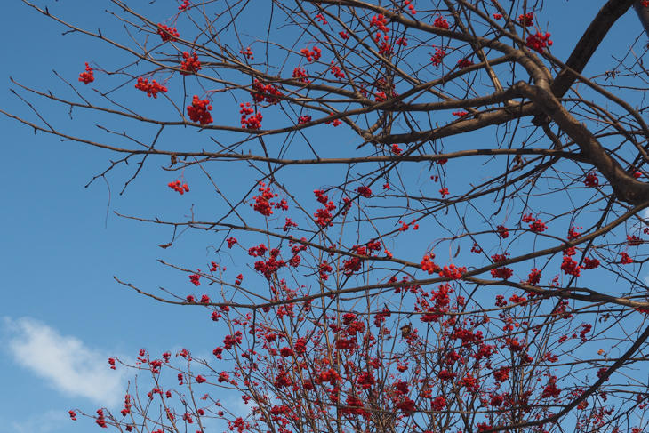 ナナカマドの実が印象的なのは、葉が落ちた裸の木が多いなか、唯一、木と空のコントラストのなかに彩りを加えているからかもしれません。