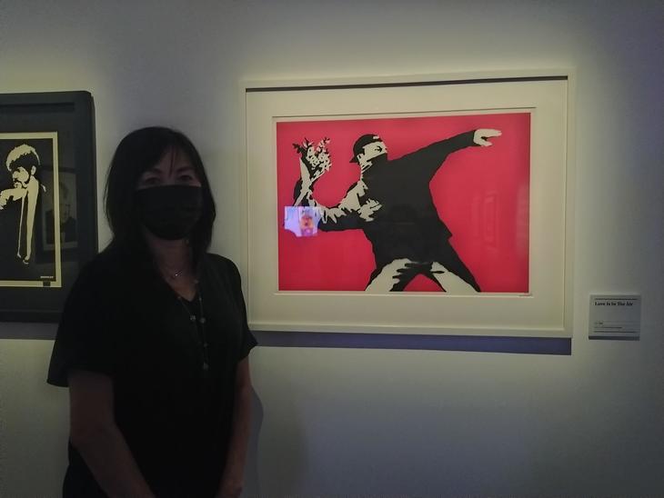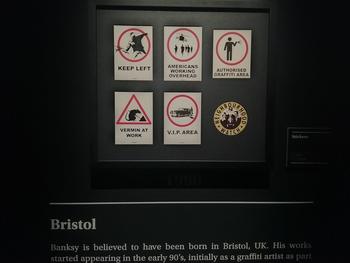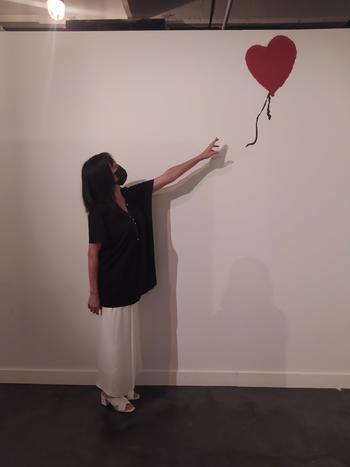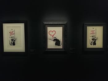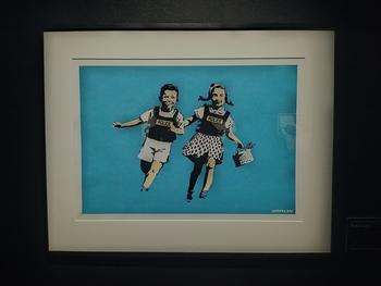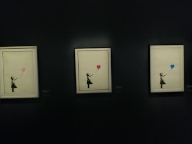 ボケてる……なんせこのシカゴの展示会場は暗く、絵に光を当て際立たせているのでiPhoneじゃない私の携帯ではムムム、難しい……単に使いこなせていないだけかも? この絵もバンクシーと言えばの作品のひとつに君臨していて、壁とキャンバスの両方に描かれています。黒色で描かれている女の子と真っ赤なハートの風船の対照的な色合いの絵は、その風船を掴もうとしているのか、逆に離してしまったのか、離れてしまったのか……。