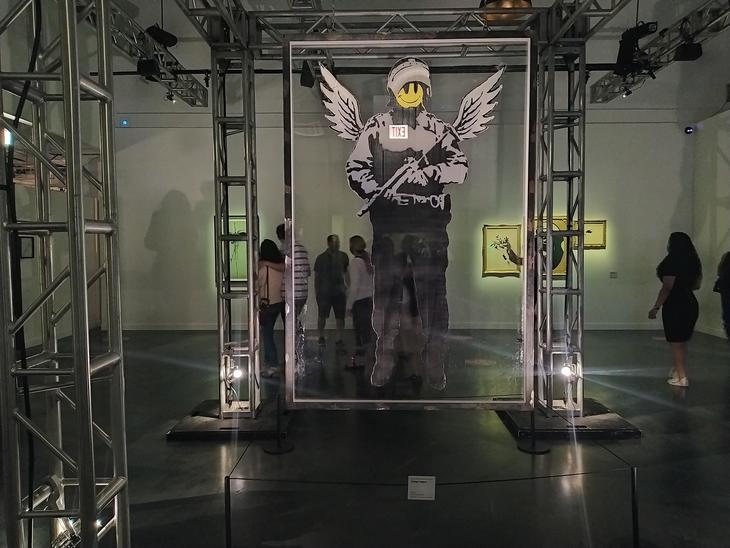 こんな大きな作品もあり、スマイリーマークの顔を持つ兵士と銃、天使の羽が真逆なのかつながっているのか。