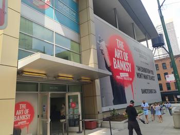 変更後の開催場所はシカゴダウンタウンのど真ん中! あのトランプタワーの真横です。なのでそのトランプタワーに駐車して、バンクシーの後はそこのレストランでランチをするコースを決行! 会場のあるビルには大きな宣伝看板があり、ワクワク感が増してきました。