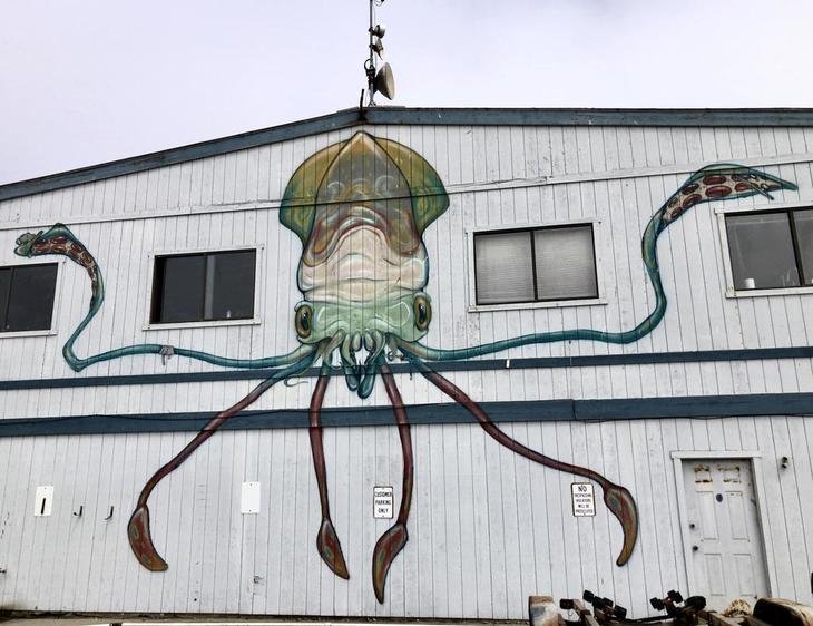 モスランディングの南側には、小さい漁港があります。倉庫には大きなイカの壁画が描かれていました。こちらからは、エルクホーンスローの遊覧ツアーが出ています。