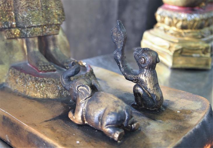 座仏の足元をみると、たしかに水とハチの巣をそれぞれ献上するゾウとサルがかわいくちょこんといます。私の生まれ曜日は「水曜日の夜」なので、こちらの仏像に手を合わせて拝んでみました。