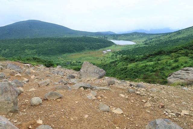 広い山頂の先から魔女の瞳こと「五色沼」を望みます。