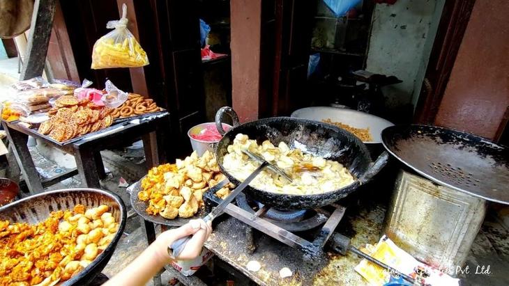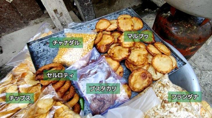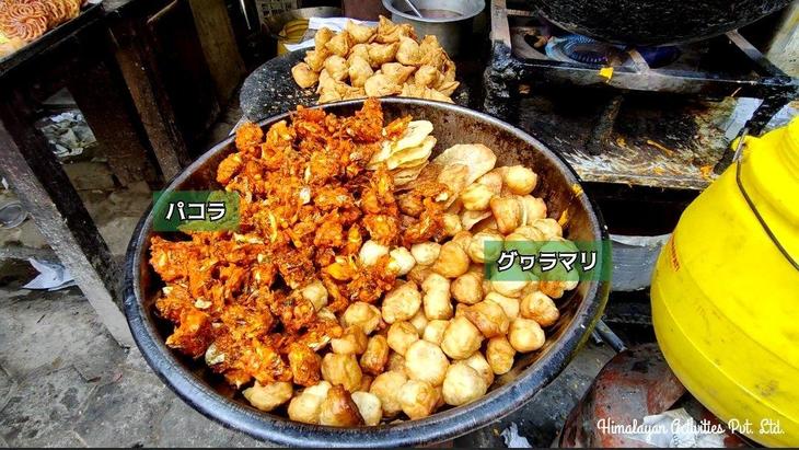 作りたてパコラ(ネパールのかき揚げ)やグヮラマリ(一口ドーナツ)1個2ルピー、サモサ1個10ルピー、セルロティ1個5ルピーと超良心的なお値段(1ルピー≒1円弱)。