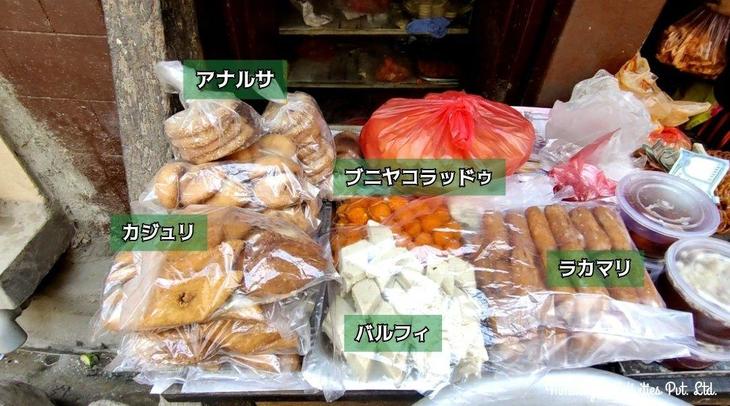 サモサ・パコラ・ジェリ・セルロティ・ラルモン・ニムキ・ラカマリ・グヮラマリ・カジュリ・マルプァ・アナルサ・フランダナ・プスタカリ・グドゥパック・ブニヤコラッドゥ・チャナダル他いろいろ。