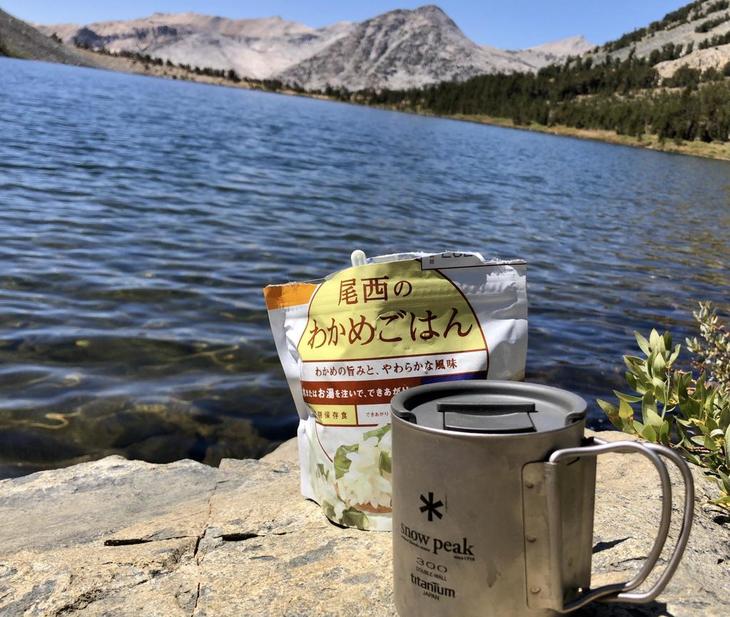 湖畔でいつものアルファ米でランチ。フリカケをかけて熱湯を入れるとおいしくいただけました。