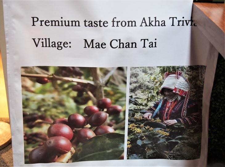 この店で販売されているのは、タイ北部チェンライに位置する「メーチャンタイ村」という220人ほどの小さな村に暮らす少数民族「アカ族」が栽培したアラビカ種コーヒー。この店の出店は、メーチャンタイ村のコーヒー生産者組合と日本のNPO団体が共同ではじめた社会事業です。