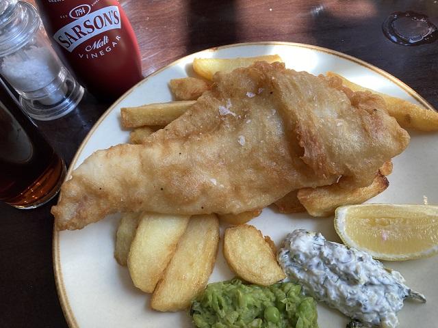 先日は私がこのフィッシュ&チップスを、そして連れがハンバーガーをいただきました。毎日その日の新鮮な魚を使うというフィッシュは、この日はハドックというタラの一種でした。