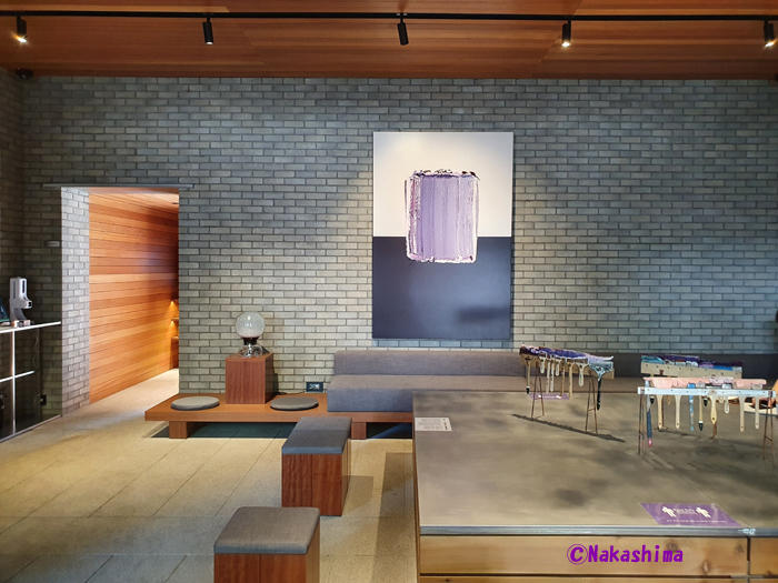 店内中央に掛けられたパープルカラーの絵が印象的で、ところどころに紫がポイントの作品が置かれています。