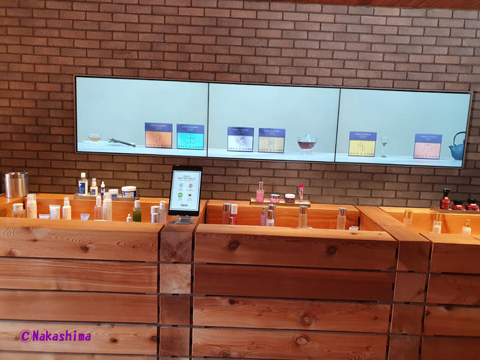 二階は、コスメブランドISOIの商品が並び、テスティングもできるビューティショップを兼ねたフロアになっています。