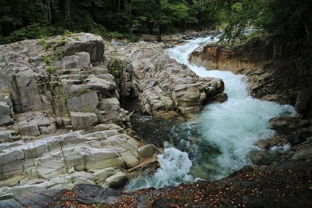 伊南川沿いに続く奇岩群を特徴とするスポットで、紅葉期を中心に人気があります。