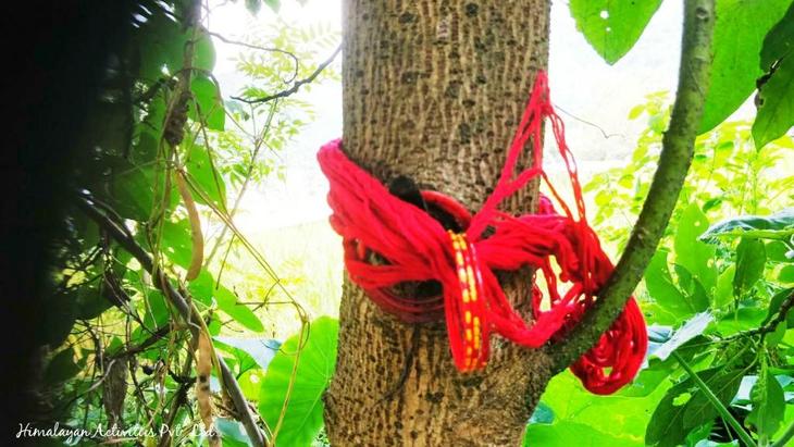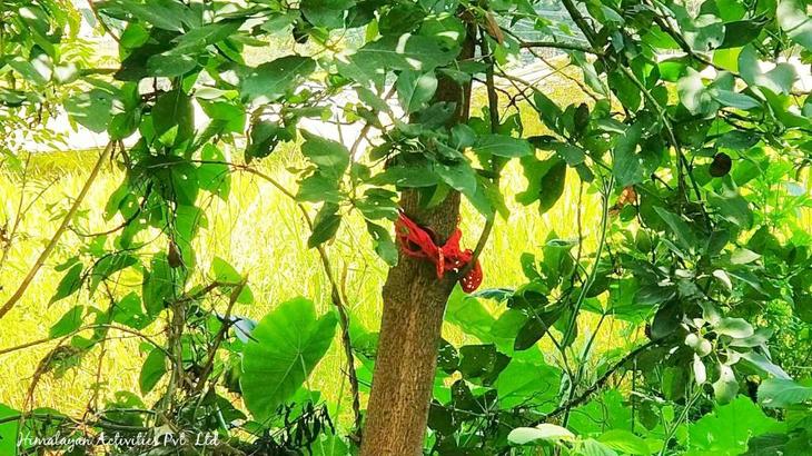 以前、知人宅にあるアボカドの木がなかなか実をつけず、人間の女性がつけるチュラ(चुरा腕輪)と、髪に編み込み使う赤いダゴ(धागो糸の束)を写真のように木に巻き、女性化させる儀式をしたことがありました。