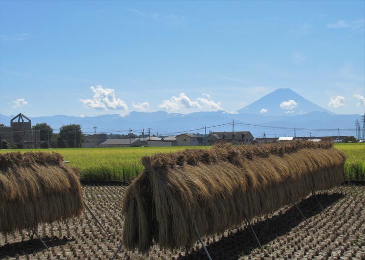 五穀豊穣を祈って「鳥飼いの神事」が行われていた「當麻戸神社」の周りは、「藤井平五千石」と呼ばれる田園地帯が広がっています。富士山も、田んぼの稲を見下ろしていました。