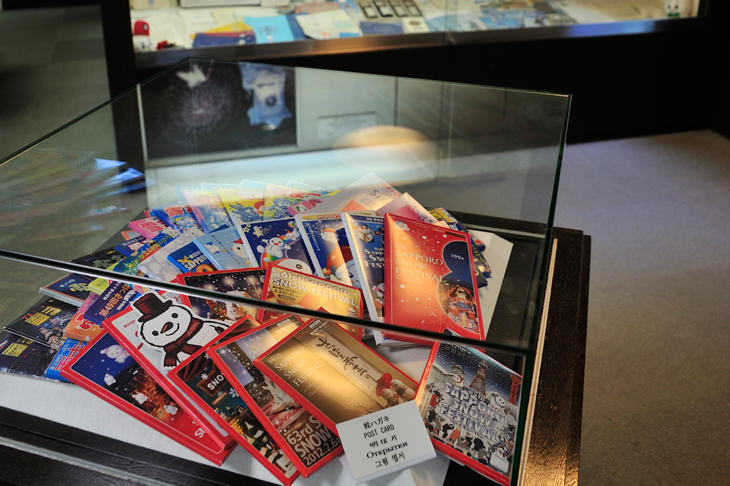 パンフレットから国際雪像コンクールの入賞メダル、選手団バッジ、毎年制作されるさっぽろ雪まつりオリジナルマスコット缶バッジ、ネクタイピンなど記念グッズ、古いものではオリジナル「テレホンカード」の展示もあります。