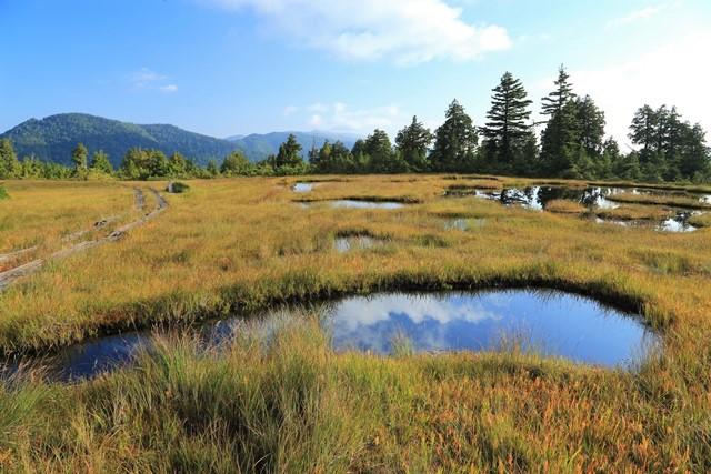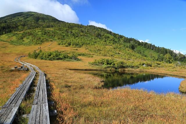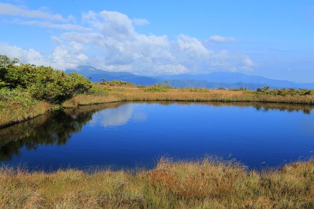 青空を映し込む池塘と中央奥に会津駒ヶ岳