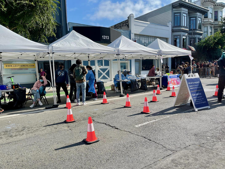 そして、ゲートでワクパス(ワクチンパスポート)の提示! サンフランシスコ市内のイベントではもう常識になっています。その脇に、Covid-19のテストサイトとワクチン接種サイトが設けられていました。利用者はほとんどいませんでしたが、万が一受けたいと思ったときには、受けられる体制になっています。マスク着用も明記してあり、持っていない人には無償で配布していました。主催者の"絶対にコロナから参加者をも守る"姿勢がうかがえます。ダメはダメ! グレーゾーンのない対応が参加者にも自ずと意識を持たせます。